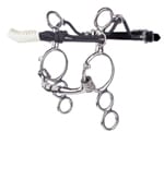The 3-ring combination bit has a noseband and chin strap incorporated into the bit and three rings as the shank; it is designed to distribute pressure in places other than, or in addition to the mouth, including the nose, poll and chin. You use the reins attached to the middle ring in order to ride more off nose pressure or the lower ring to use mouth pressure first and have stronger ‘brakes.’